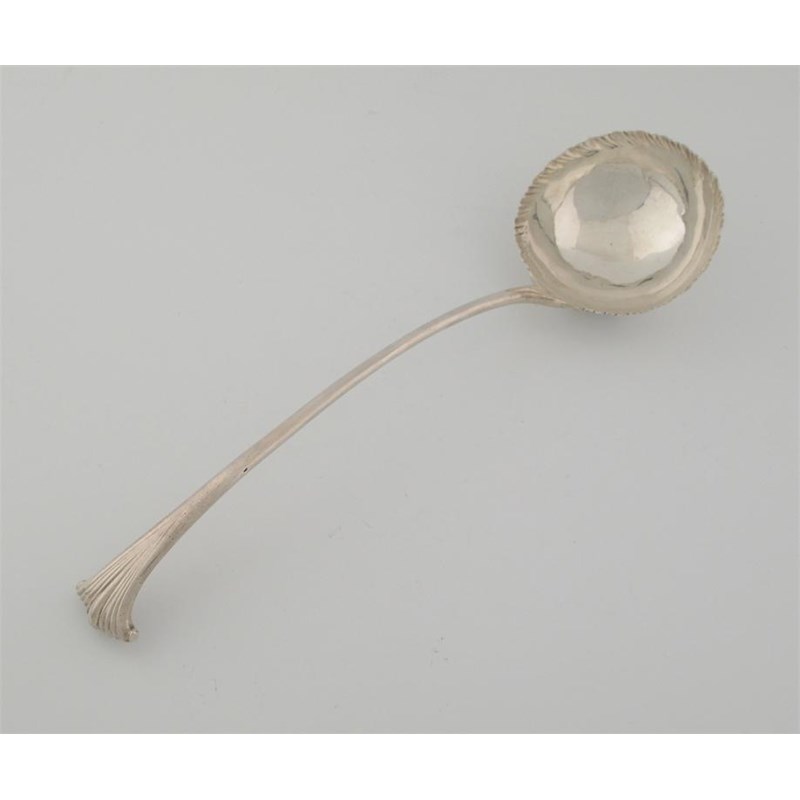 A George III Onslow pattern soup ladle with feathering around the edge of the bowl, initialled, maker's mark distorted, London 1761, 6oz.