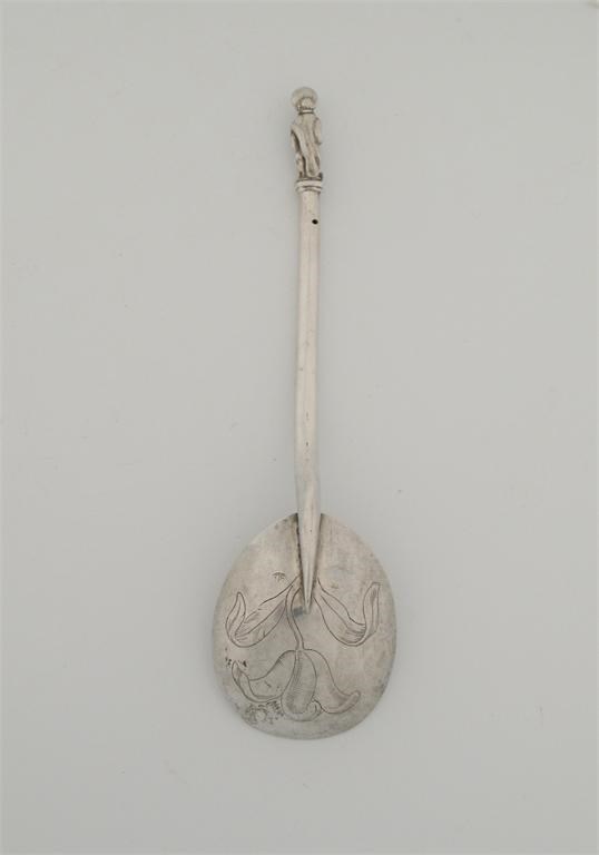 A late 17th/early 18th century continental apostle spoon with a curved hollowstem, the back of the bowl engraved with a stylised flower, maker's mark 'CB', town mark unclear, (a shield?) probably Swiss, 7in (18cm) long, 1oz.