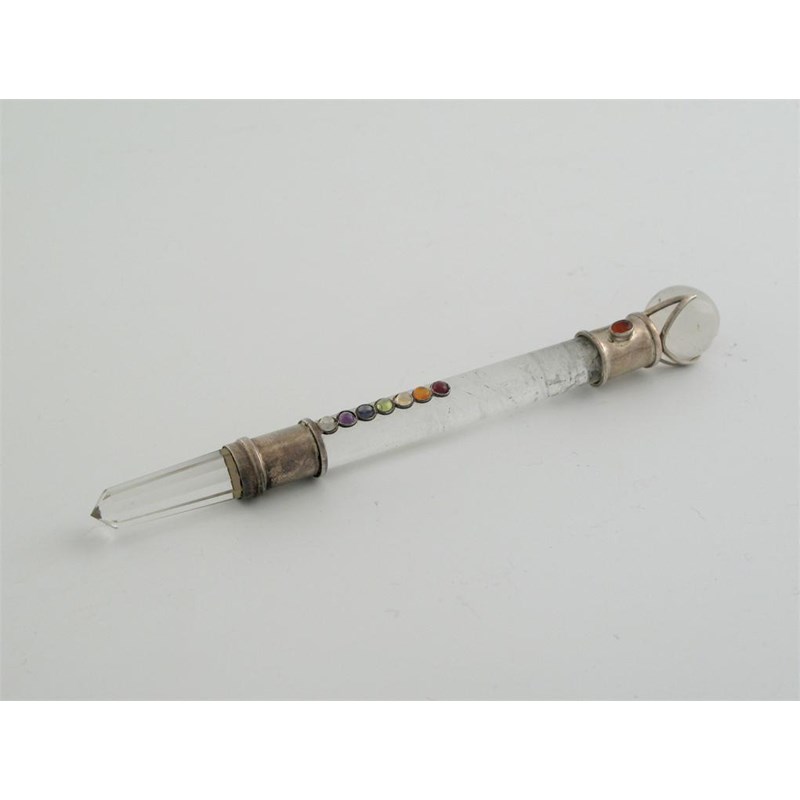 A rock crystal mounted tip staff, with faceted tip, set with a row of seven coloured cabochon stones, the terminal clasping an orb, 7in (18cm) long.