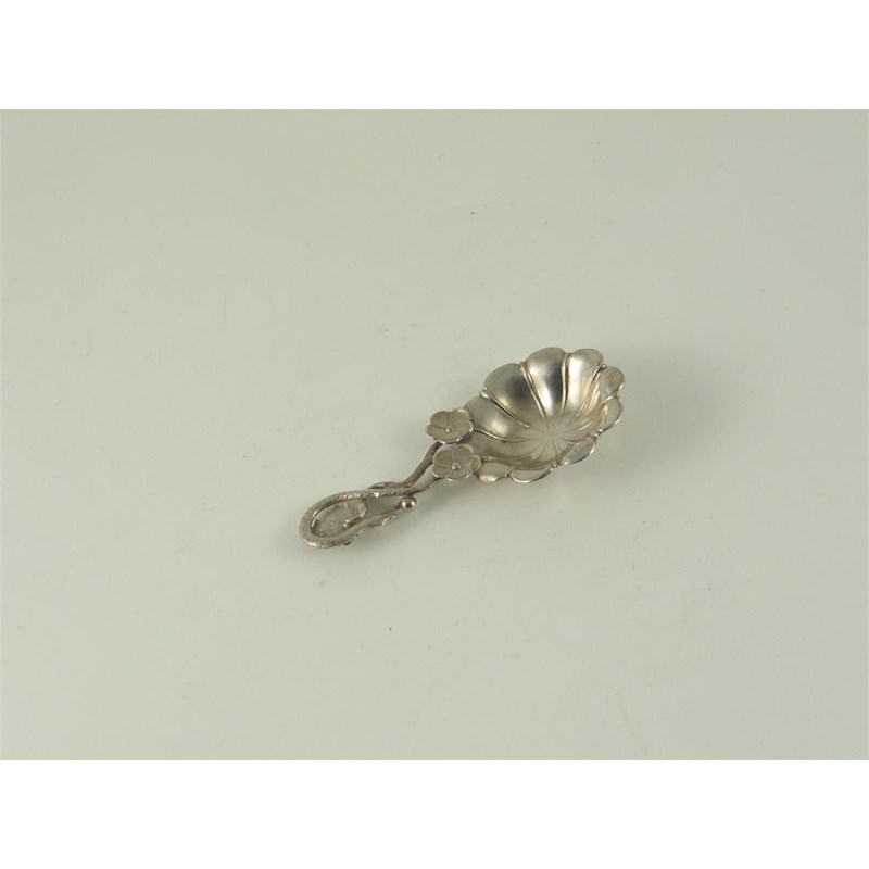 WITHDRAWN A Victorian floral caddy spoon, the tendril stem with an applied leaf and two small florets, petalled bowl, by Hilliard & Thomason, Birmingham c.1850 (no date letter).