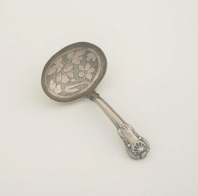 A George IV caddy spoon, with an hourglass stem and an oval bowl engraved with a bell flower, by Joseph Taylor, Birmingham 1824.