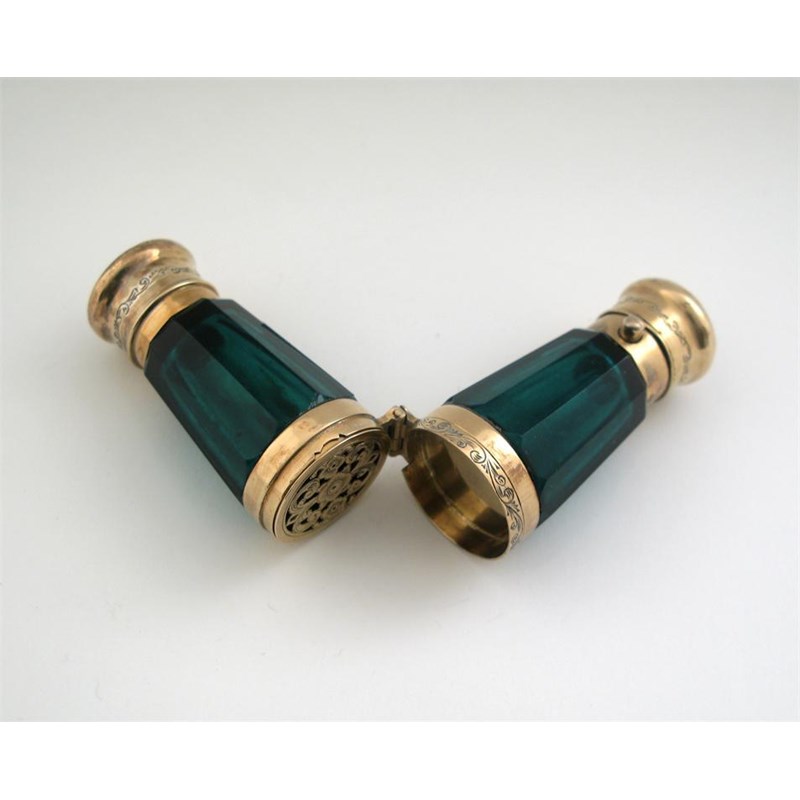 A Victorian silvergilt mounted double-ended scent, with one engraved screw cover and one 'sprung' cover, faceted green glass body hinging in the middle to reveal a vinaigrette hinged grille, incuse maker's mark of 'S. Mordon & Co. London' c. 1870, 4.75in (12cm) long.