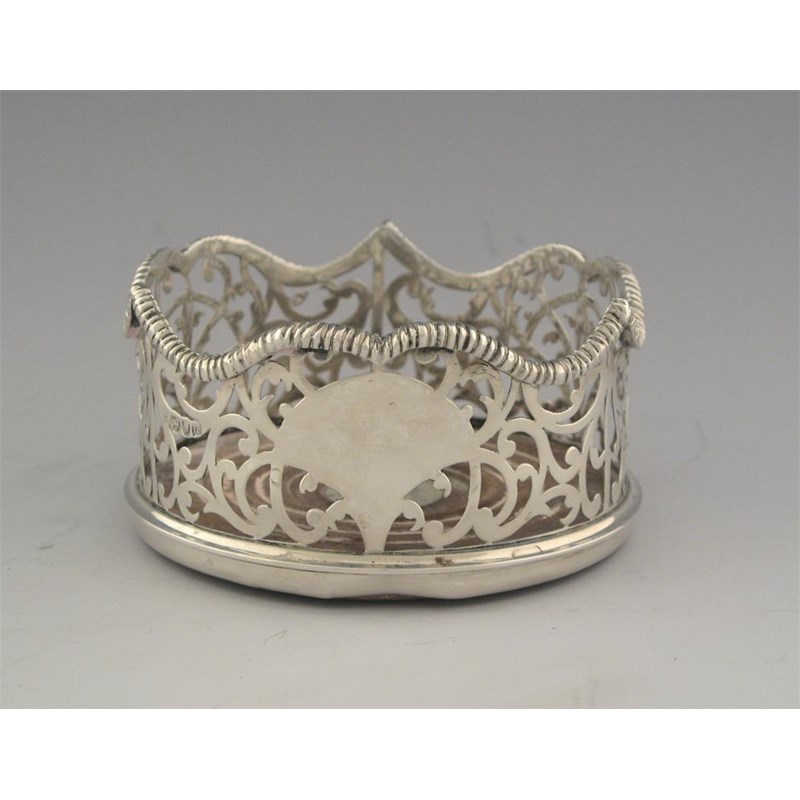 By Charles Stuart Harris: a late Victorian pierced wine coaster with a shaped, gadrooned rim and a turned wooden base with inset central boss, London 1900, 4.75in (12cm) diameter.