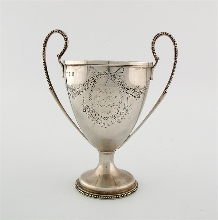 A George III presentation cup, with beaded handles and circular foot, engraved with floral swags and oval cartouches, inscribed "A token of our friendship 1783", makers mark worn, possibly by John Schofield, London, 1783, 9in (22.8cm) high, 16.5oz.
