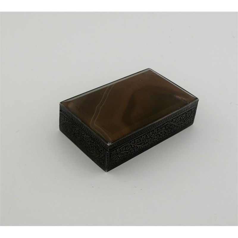 A 19th century oblong box with a hinged cover inset with a bevelled, bonded agate panel, the sides chased with floral decoration, gilt interior, unmarked, probably Indian, 4in (10cm) long.