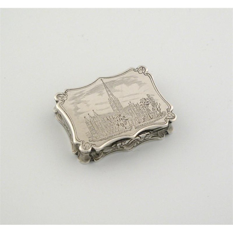 Local interest: a Victorian 'castle top' vinaigrette, with a serpentine edge, engraved with a view of Salisbury Cathedral, by Nathaniel Mills, Birmingham 1843.