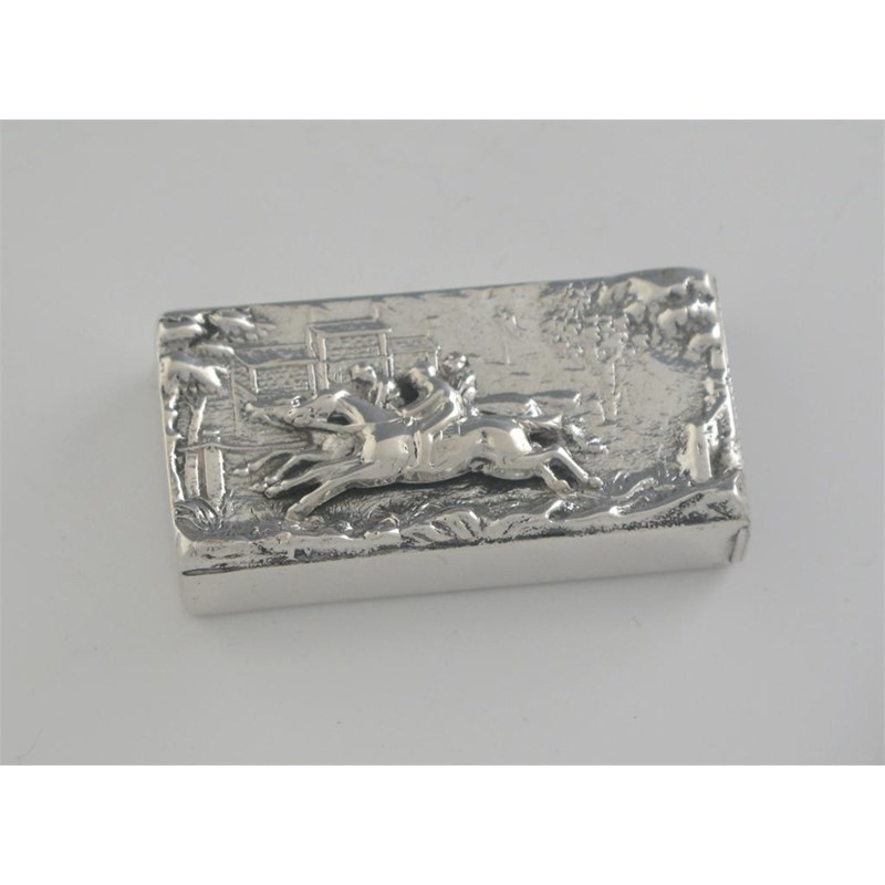 A Victorian vesta case, plain oblong with a horse race in relief, monogrammed and dated '12.2.01', by Saunders & Shepherd, Birmingham 1898, 2in (5cm) long.