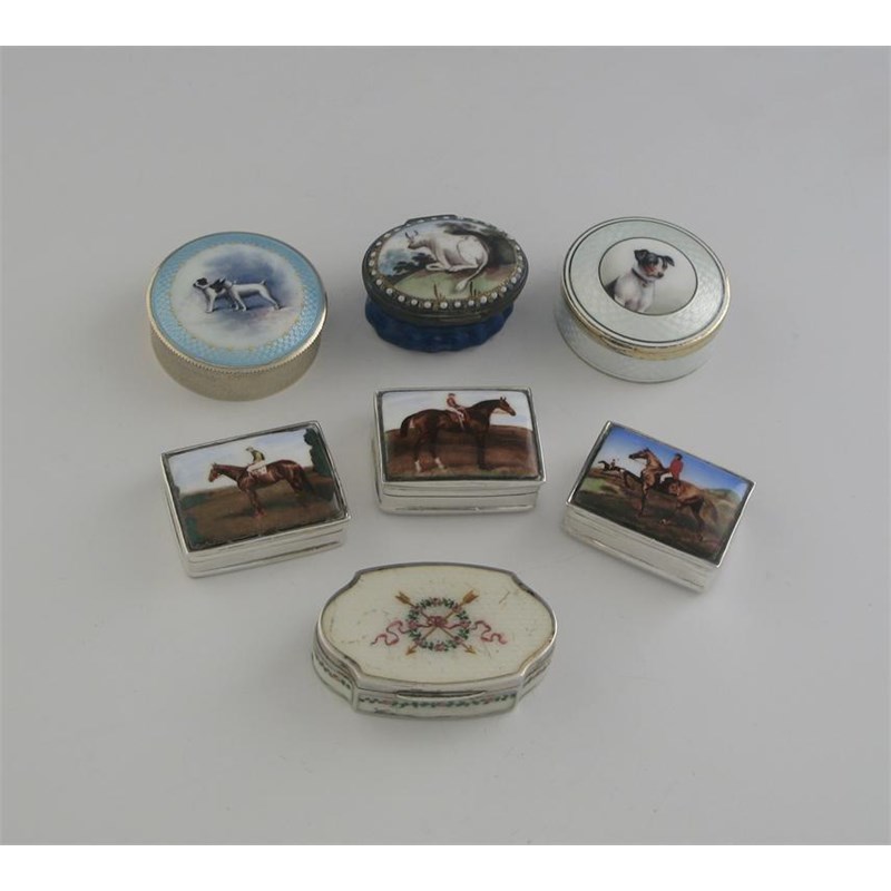 A Continental enamelled circular pill box, with the portrait of a terrier in the centre of the cover, gilt interior, another similar silvergilt, enamelled on the cover with two terriers, together with three small modern oblong pill boxes (each with an enamelled horse and rider on the cover), another enamelled pill box, by Georg A, Scheid, Vienna c. 1930 and an enamelled copper box with a seated cow on the cover. (7)
