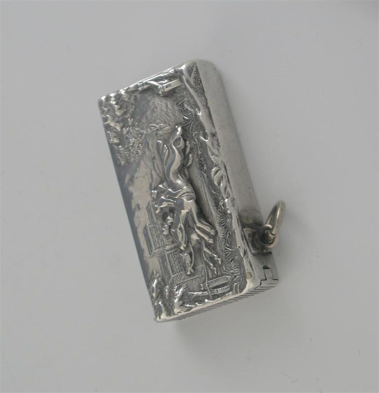 A Victorian vesta case, plain oblong with a horse race in relief, suspensory ring, by W. Neale Birmingham 1894, 2in (5.2cm) long.