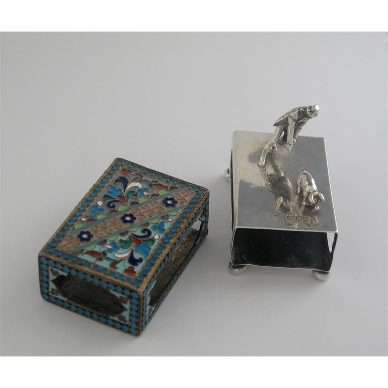 A Russian cloisonne enamelled matchbox mount, c. 1900, and an Edwardian plain example with the cast figure of a man and a pig, maker's mark worn, London 1905, the latter 2.3in (6cm) long. (2)