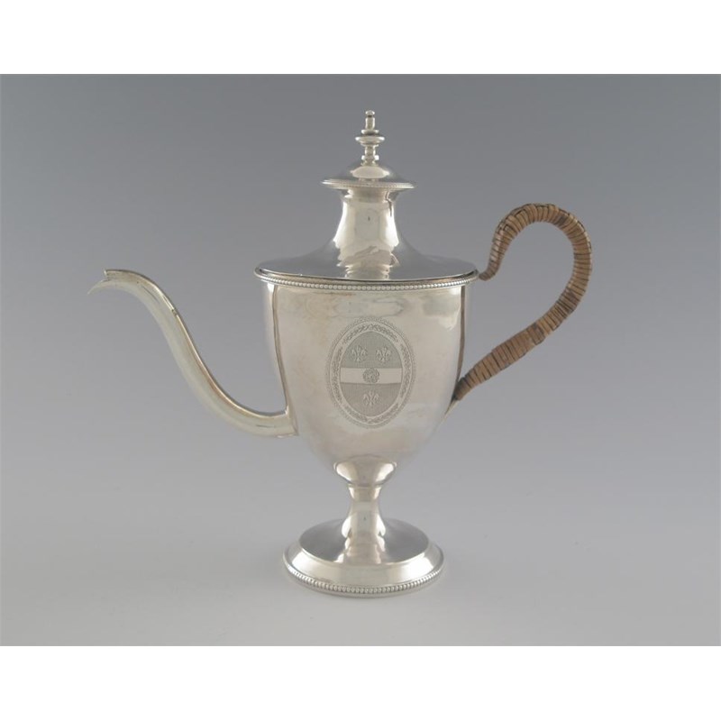 A George III vase-shaped Argyle, with bead borders, a cane-insulated handle and an engraved cartouche, with a coat of arms and crested, by Hester Bateman, London 1783, 7.5in (19cm) high, 12oz.