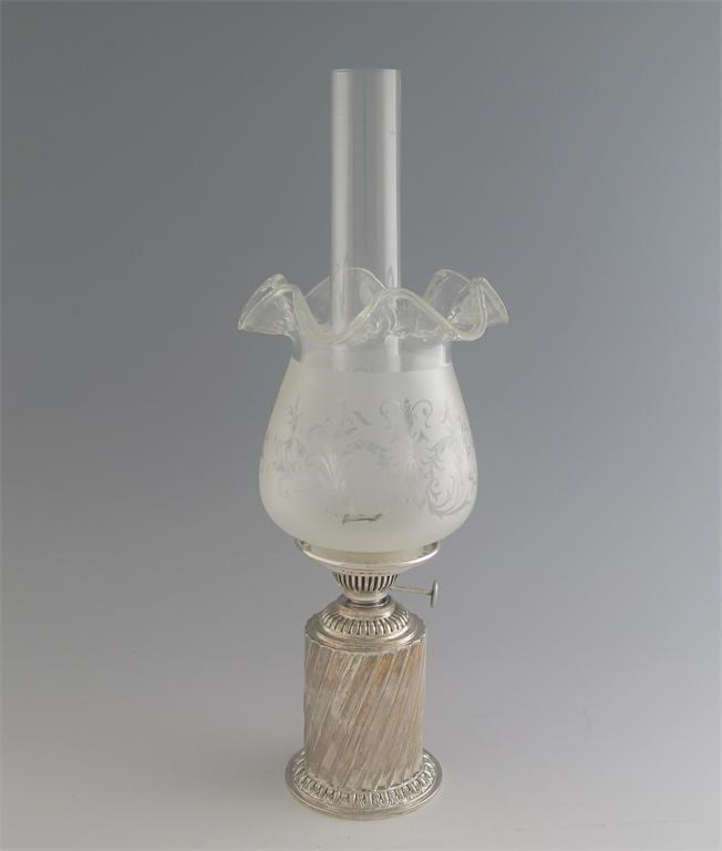 A Victorian lamp, with a swirl fluted cylindrical base, a plated wick holder and a glass chimney and shade, the base by H. Wilkinson & Co. Ltd. London 1890, 16.4in (41.5 cm) high overall.