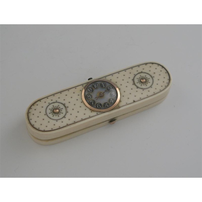 A gold mounted ivory toothpick box, with rounded ends and a counter dial (behind glass) in the centre of the cover flanked by piqu? work decoration, 3.5in (9cm) long.
