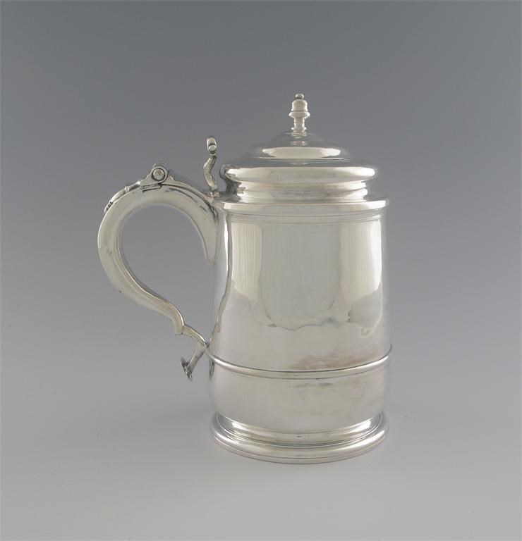 Early Racing Interest: a rare, early George II provincial tankard, with a scroll handle, domed cover and knop finial, the body engraved with a horse and rider and inscribed 'Newcastle 1729', 7.75in (19.5cm) high, 24oz.