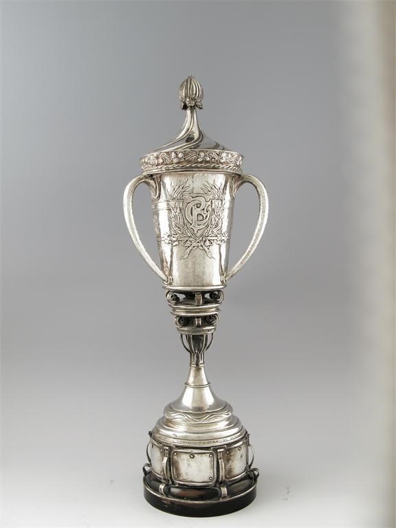 By Omar Ramsden & Alwyn Carr: a large Edwardian three handled cup and cover, on a domed and spreading foot with a tiered pedestal, decorated with scroll and flying buttresses, the bowl embossed in low relief with a monogrammed shield "BC" and the inscription "To the memory of Christopher B. Lynch who died 3rd February 1906 for many years a member o the Byculla Club - Presented to the Club by his friends in the club", the cover wrythen and rising to a high dome, terminating in a bud finial, London 1906, with matching, mounted wooden plinth set with vacant plaques, the cup and cover 18in (46cm) high, the foot incised "OMAR RAMSDEN ET ALWYN C. E. CARR ME FECEGUNT", 42Ooz.