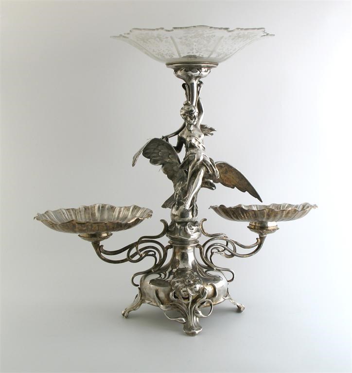 A late 19th/early 20th century centrepiece, with a domed floral base, supported by a scantily clad maiden astride an eagle, flanked by two flowerhead dishes and holding an etched wavy-edge dish, by WMF, 21.25in (54cm) high.