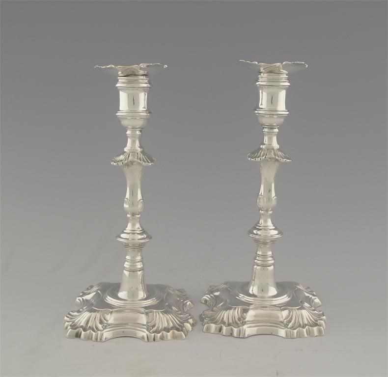 A pair of modern Britannia standard cast candlesticks in the George II style with shaped square...