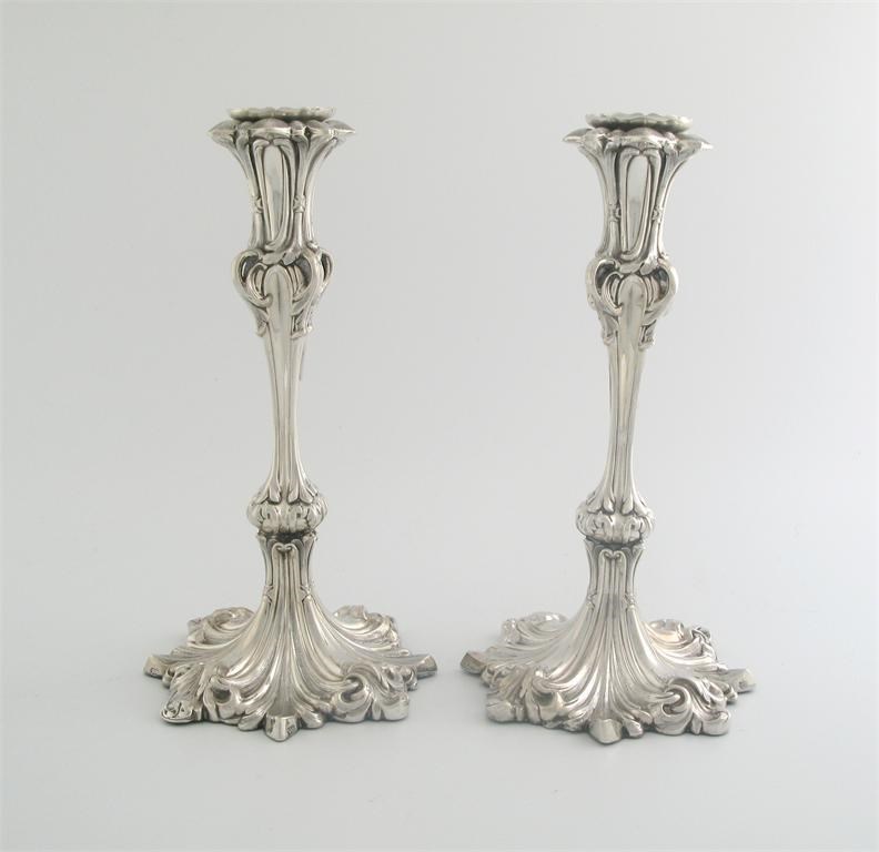 WITHDRAWN A pair of Victorian candlesticks, on writhen foliate bases, tapering sinuous stems with tulip flower capitals, detachable nozzles, by H Wilkinson & Co, Sheffield, 1841, 10.6in (26.3cm). (2).