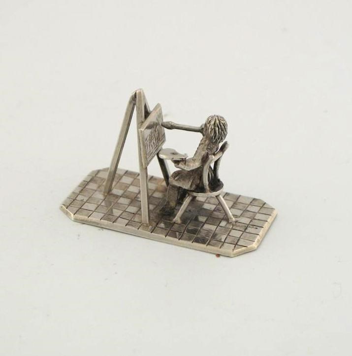 An artist at his easel holding a palette and painting a picture of a house. 1.8in (4.9cm) long.