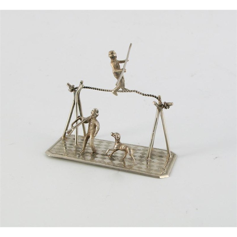 A tight rope walker, holding a balancing pole, a circus performer playing a trumpet and a dancing dog, on a checkerboard base.