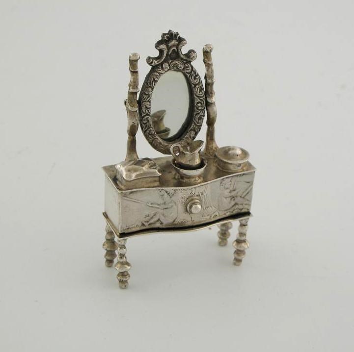 A serpentine front dressing table, on bobbin supports, pull-out drawer embossed with putti, swing frame mirror, with dressing table items, 3.1in (7.8cm) to top of mirror.