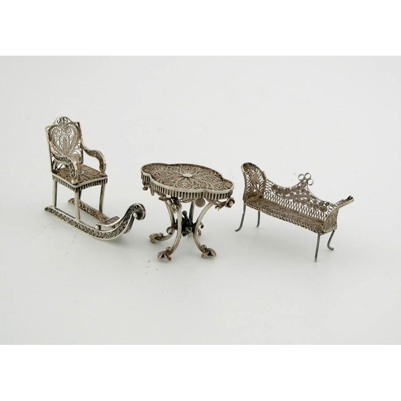 Three filigree examples: a bench seat, sled and table on four scroll supports. (3)