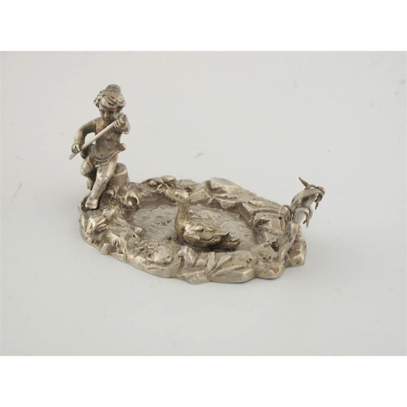 A German late 19th example, a putti seated on a tree stump beside a pond with a duck and fish in the water, 3.5in (8cm) long.