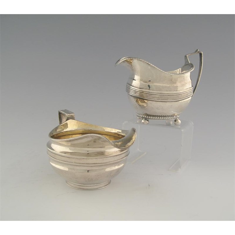 A George III squat circular cream jug with a bifurcated angular handle, helmet rim and gilt interior, crested, by John Emes, London 1805, together with another George III cream jug on ball feet, London 1807, 14oz. (2)