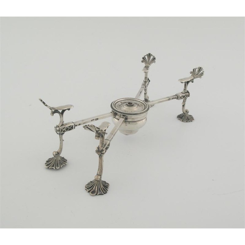 A George III adjustable dish cross on pierced shell feet with central burner, by William Plummer, London 1772, 9.25in (23.5cm) long, 14oz.