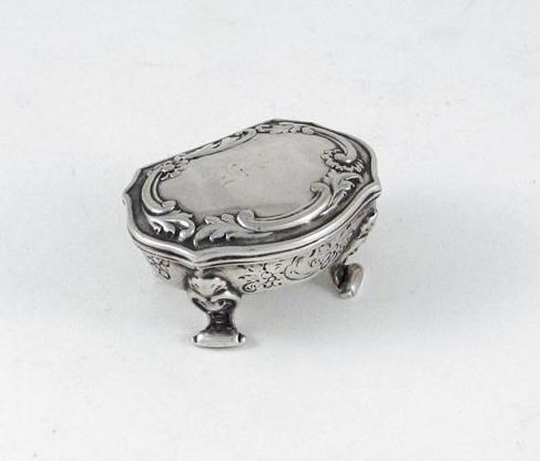 An early 19th century Austro Hungarian spice or snuff box, cartouche shaped, on four ornate scroll feet with a decorated, hinged cover and two internal compartments, maker's mark "M & K", Vienna 1820-30 date letter unclear, 2in (5cm) wide, 1.5oz.