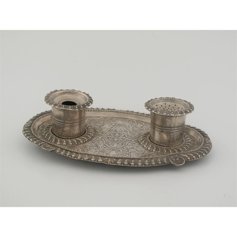 An early 18th century German inkstand of shaped oval outline with borders of shells, gadrooning and beading and chase formal scroll work in the centre, fitted with two detachable pots, button feet, maker's mark 'V.I', Augsberg first third of the 18th century, 9.25in (23.5cm) long, 10oz.