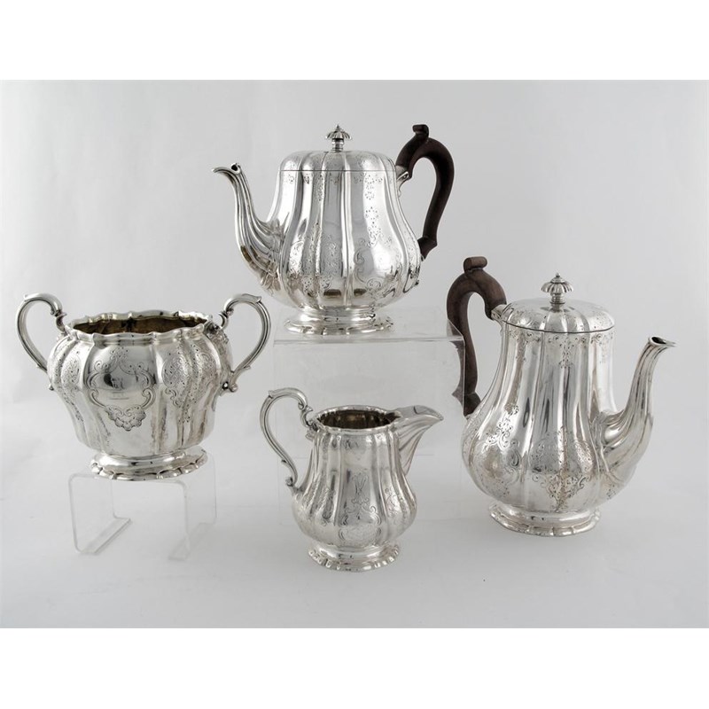 A Victorian four piece tea service, the fluted baluster bodies chased with vignettes of scrolls and diaperwork, each piece engraved with a crest on one side and a coat of arms on the other, scroll handles, the cream jug and sugar bowl with gilt interiors, by Robert Garrard, London 1851, 73.5oz. (4)