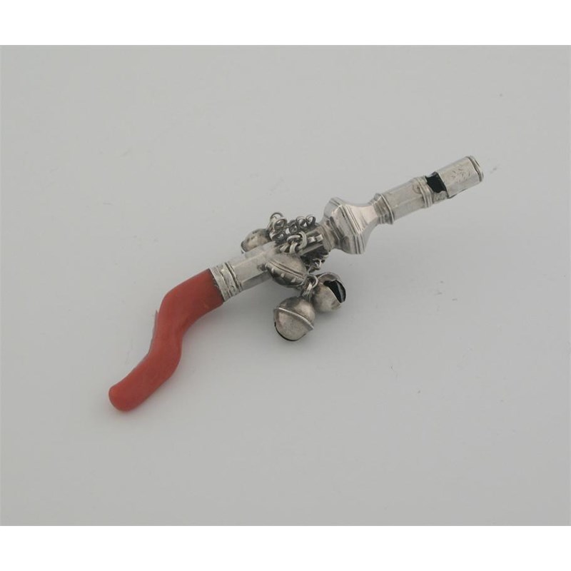 A George II child's rattle with an octagonal baluster body, coral teether and whistle terminal (some bells missing, some replaced), maker's mark only 'TM' [monogram] unascribed 1730-40, 4.8in (12.2cm) long.