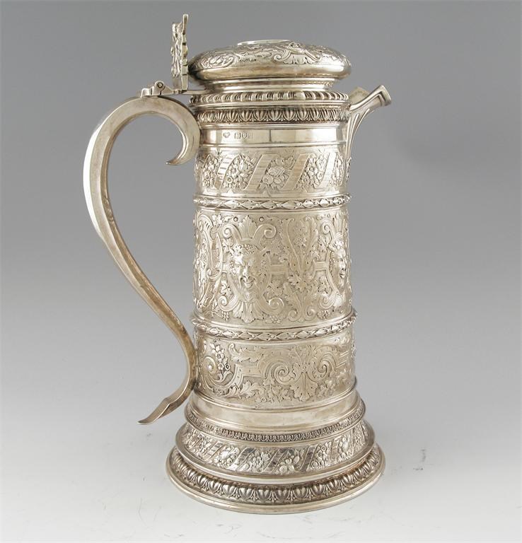 A large modern reproduction of a Charles I flagon, tapering and profusely decorated with embossed work around in bands and separated by various mouldings and girdles, the hinged cover with a flattened dome and a winged figure thumbpiece, by the Goldsmiths & Silversmiths Co Ltd, London 1911 (cased) 13.5in (34.4cm) high, 83oz.