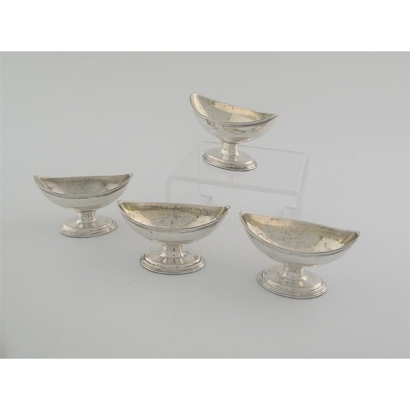 A set of four George III navette-shaped salts with reeded borders and pedastal bases