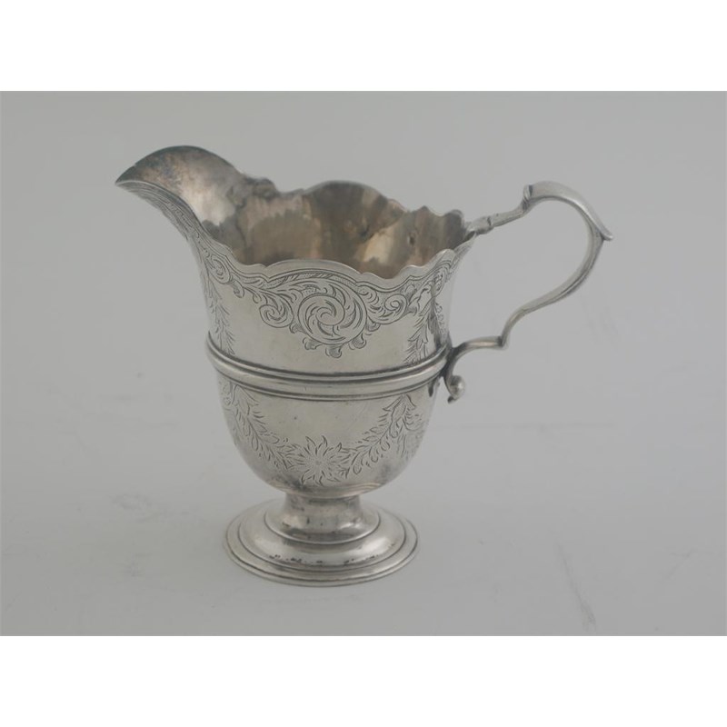 A George II/III Irish helmet cream jug, on a turned pedestal foot, with a scroll handle, moulded girdle and engraved decoration, the foot scratched underneath with the initials "R" over "SE" maker's mark lost in decoration, Dublin c.1760, 3.75in (9.5cm) high, 4oz.