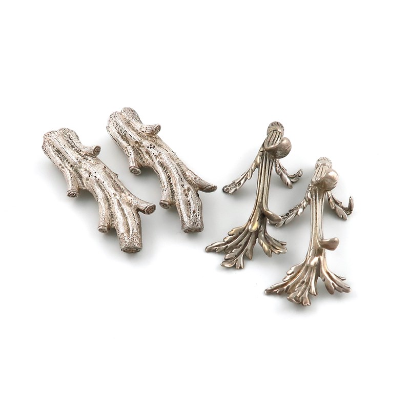 naturalistic leaf and branch form, length 9.1cm, plus a pair of Victorian Scottish silver knife rests, modelled as a tree trunk, approx. total weight 5oz. (4)