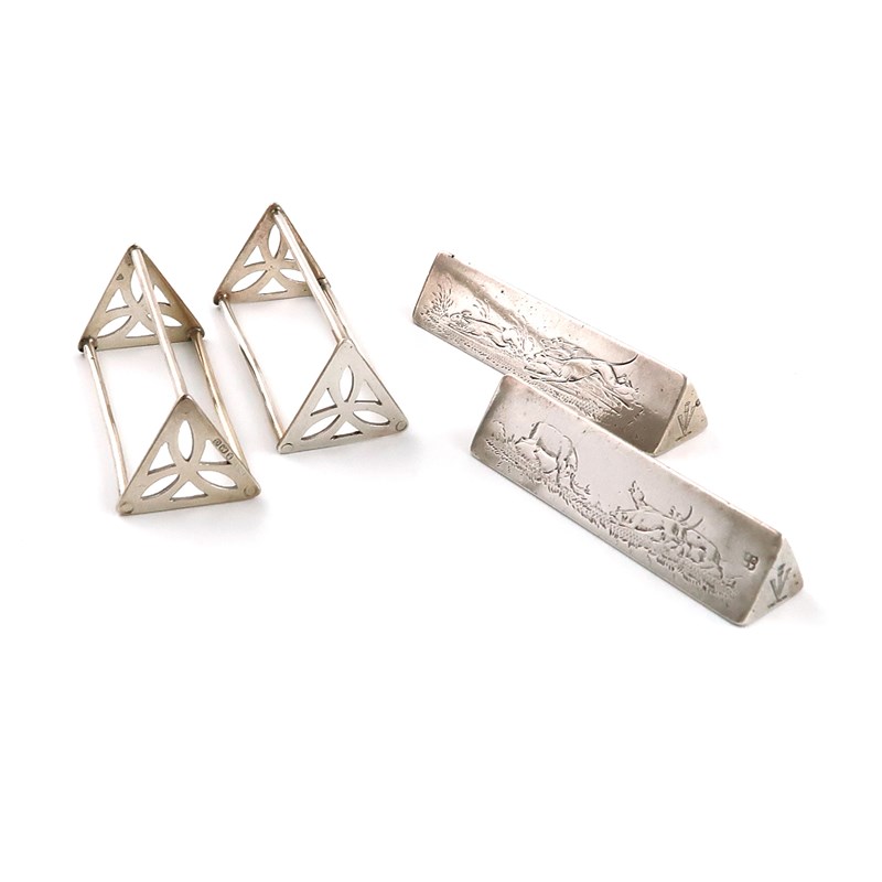 triangular form, engraved with stag hunting and coursing scenes, engraved with a crest, length 8cm, plus a pair of George III silver knife rests, London 1811, triangular form, pierced ends, approx. weight 3.3oz. (2)