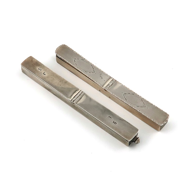 slender rectangular form, two hinged compartments, engraved decoration, length 9.3cm, plus another George III silver tooth powder box, London 1791, approx. total weight 1.1oz. (2)