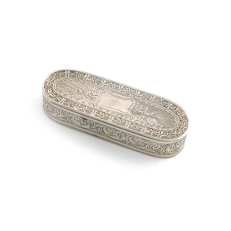rounded rectangular form, engraved radiating decoration, foliate border, with a vacant cartouche, length 8.7cm, approx. weight 1.8oz.