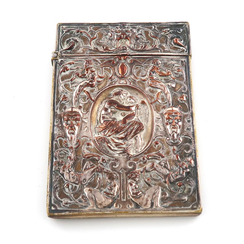 rectangular form, with classical figures and masks within foliate scroll decoration, hinged cover, length 9.8cm.