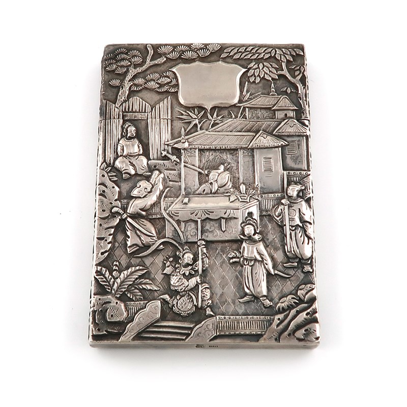 rectangular form, embossed with figural scenes in a landscape setting, the reverse with bamboo decoration, with a vacant shield cartouche, length 10.4cm.