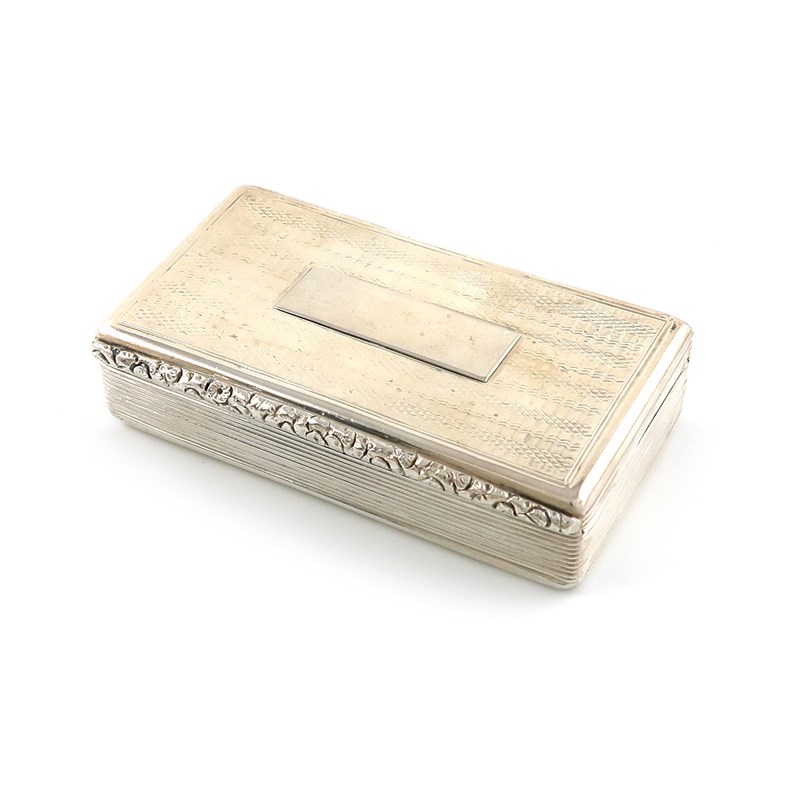 rectangular form, engine-turned decoration, the cover with a vacant cartouche, length 8cm, approx. weight 2.8oz.