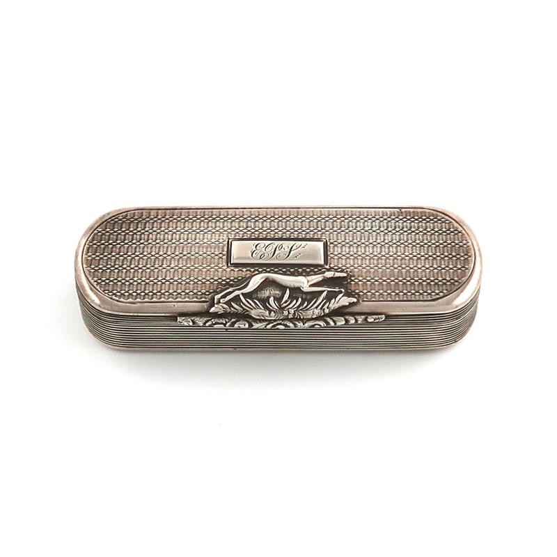 rounded rectangular form, engine-turned decoration, the hinged cover with a foliate scroll thumb-piece and mounted with a running greyhound, with an initialled cartouche, length 9cm, approx. weight 2.4oz.