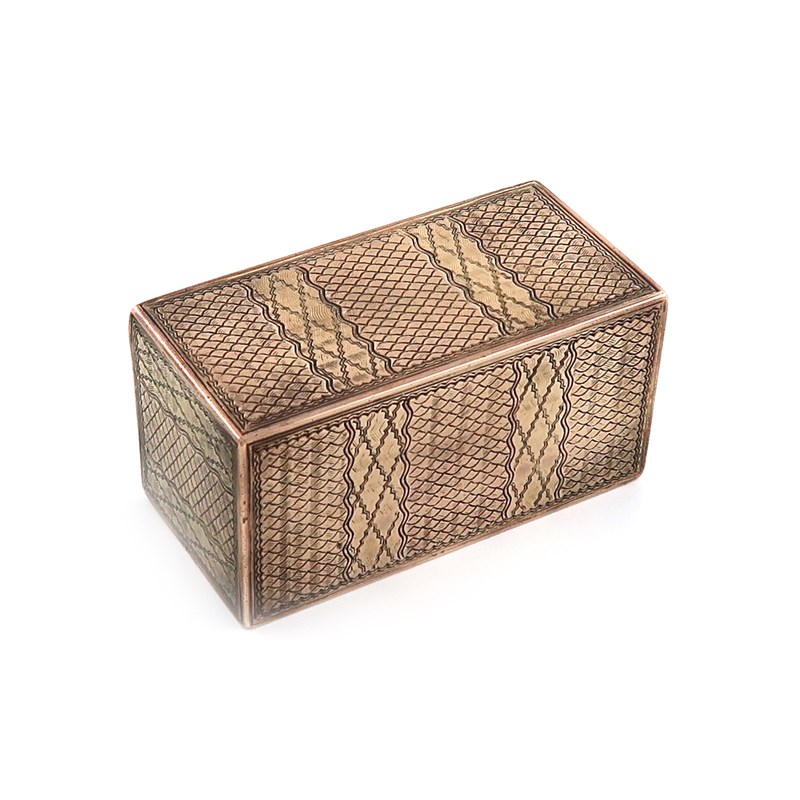 rectangular form, engine-turned decoration, with a small hinged cover which opens to release the main hinged cover, length 7.9cm.