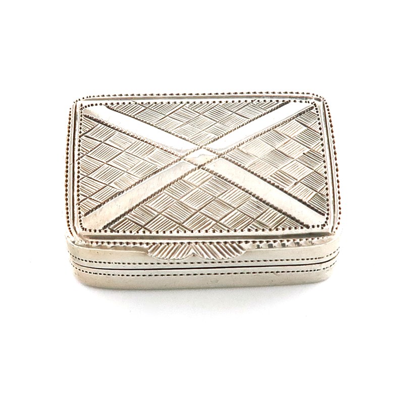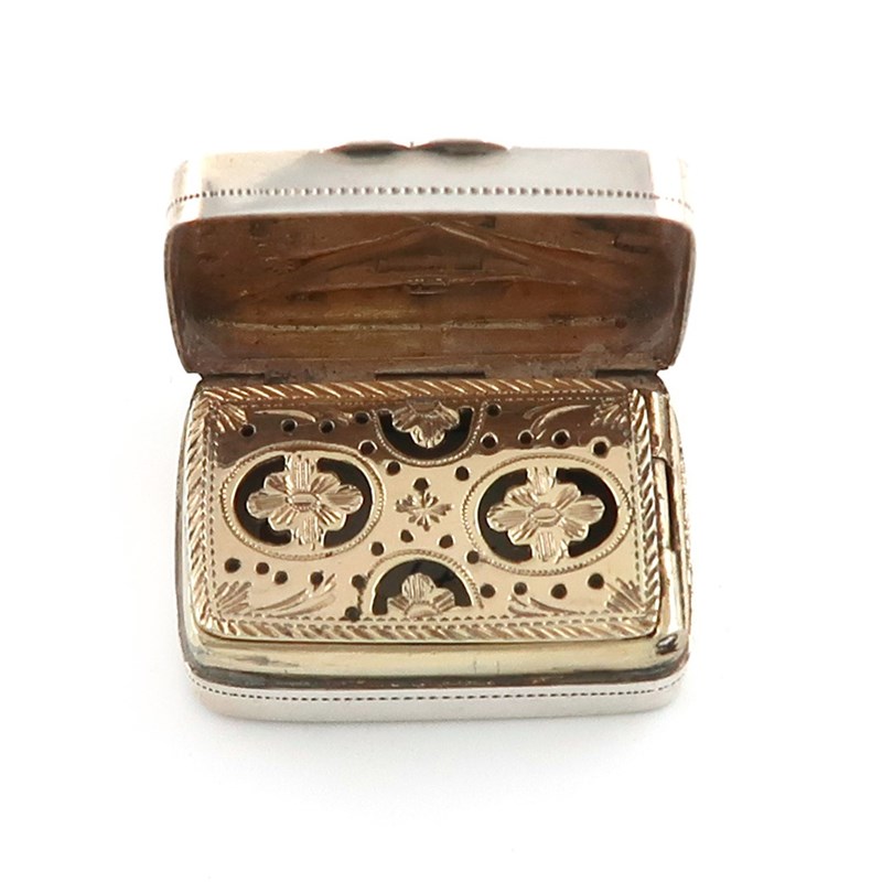 rectangular form, the cover engraved with chequerboard decoration, pierced and foliate silver-gilt grille, length 3.3cm, approx. weight 0.6oz.