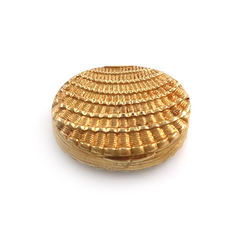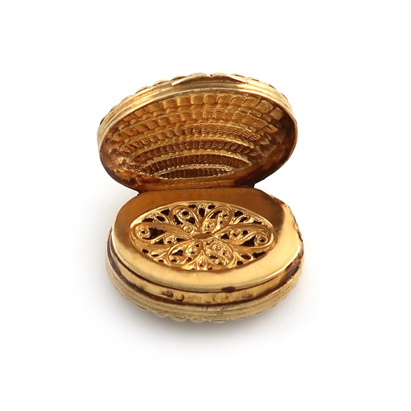 oval form, shell decoration, reeded sides, the hinged cover opens to reveal a pierced simulated filigree grille, length 3cm, approx. weight 0.4oz.