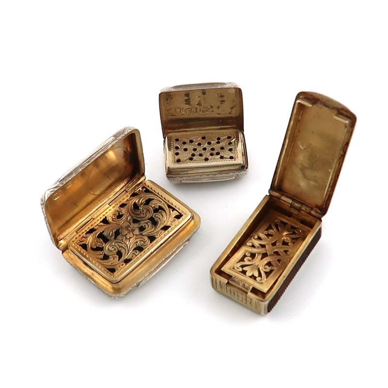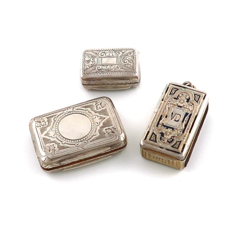 comprising: a French silver-gilt and enamel one, engraved foliate decoration, blue and white enamel, grille a.f, and with a later striker to side, a Victorian one by Thomas Johnson, London 1869, rectangular form, engraved decoration, and another by E. Smith, Birmingham 1852, approx. total weight 1.4oz. (3)