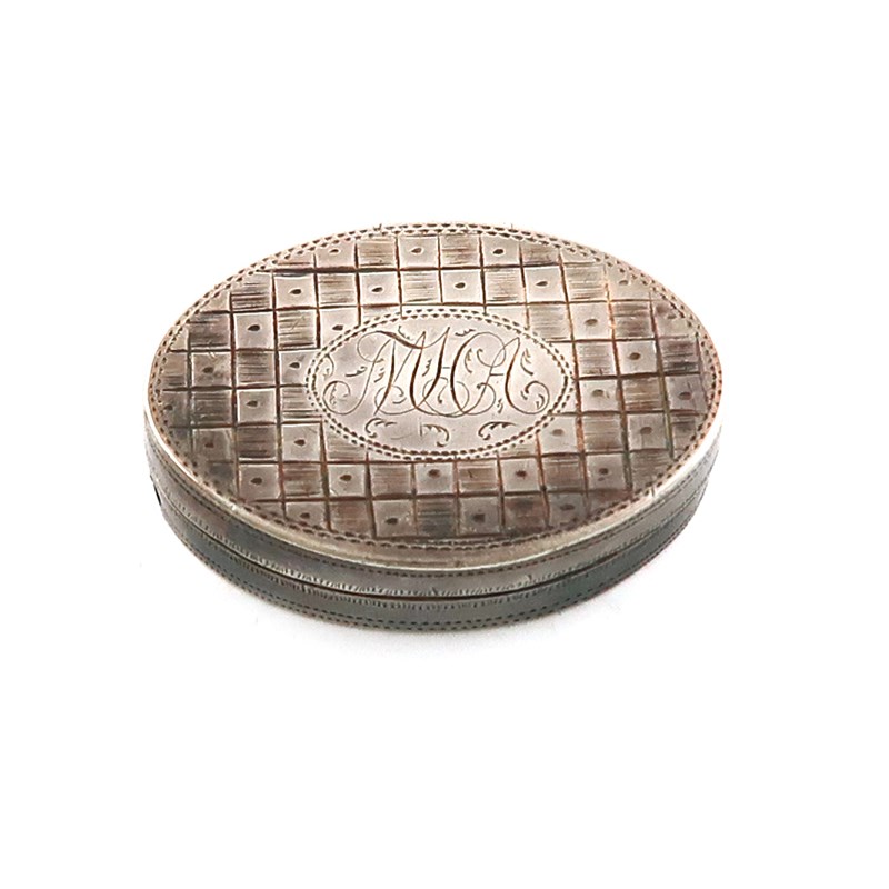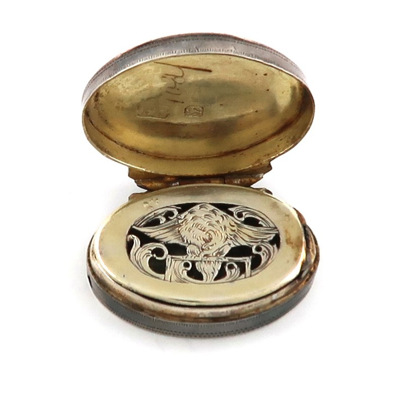 oval form, the cover with engraved chequerboard decoration, initialled, the interior with a silver-gilt engraved and pierced eagle grille, length 3.2cm, approx. weight 0.4oz.
