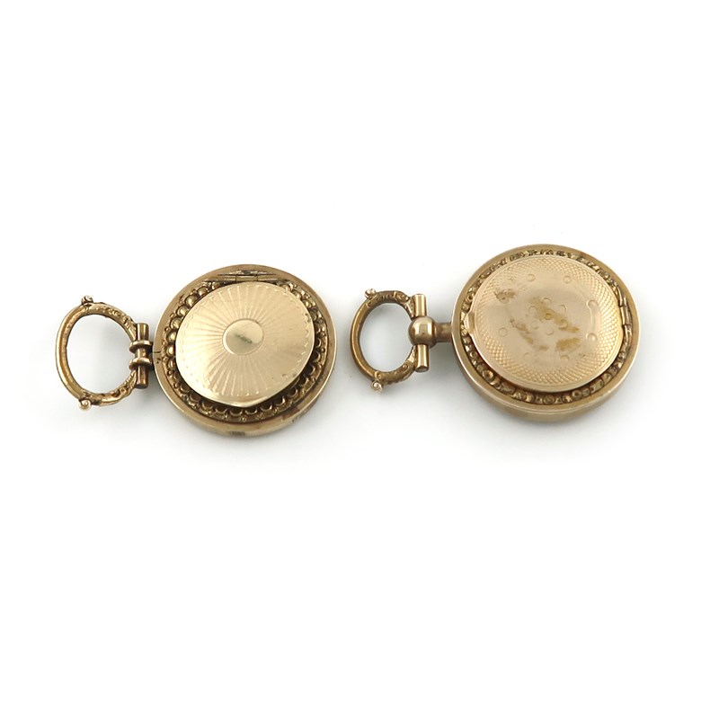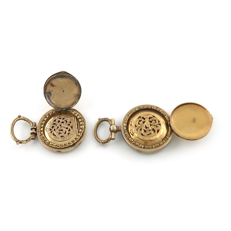 engine-turned decoration, foliate border, the interior with a pierced and engraved foliate scroll grille, plus another gilt-metal watch vinaigrette, the reverse with a compartment. (2)